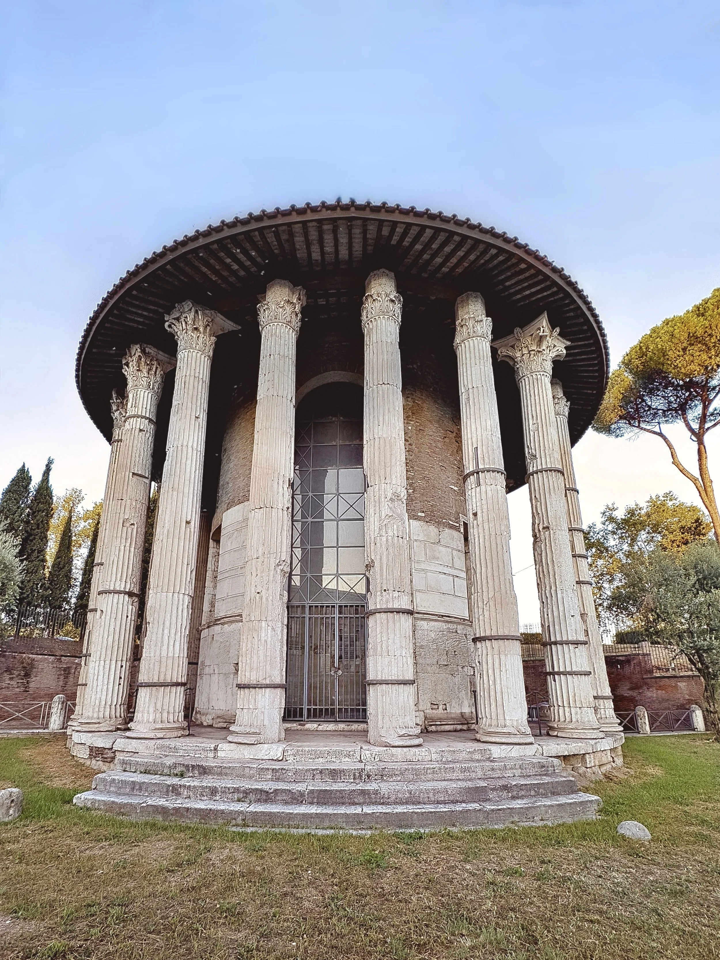 The circular building is the Temple of Hercules Victor. Romans assigned attributes to their gods, such as the ‘Victor’ here which acknowledges the hero’s completion of his various labors. The temple dates to the 2nd century BC and is the oldest complete building still standing in Rome.